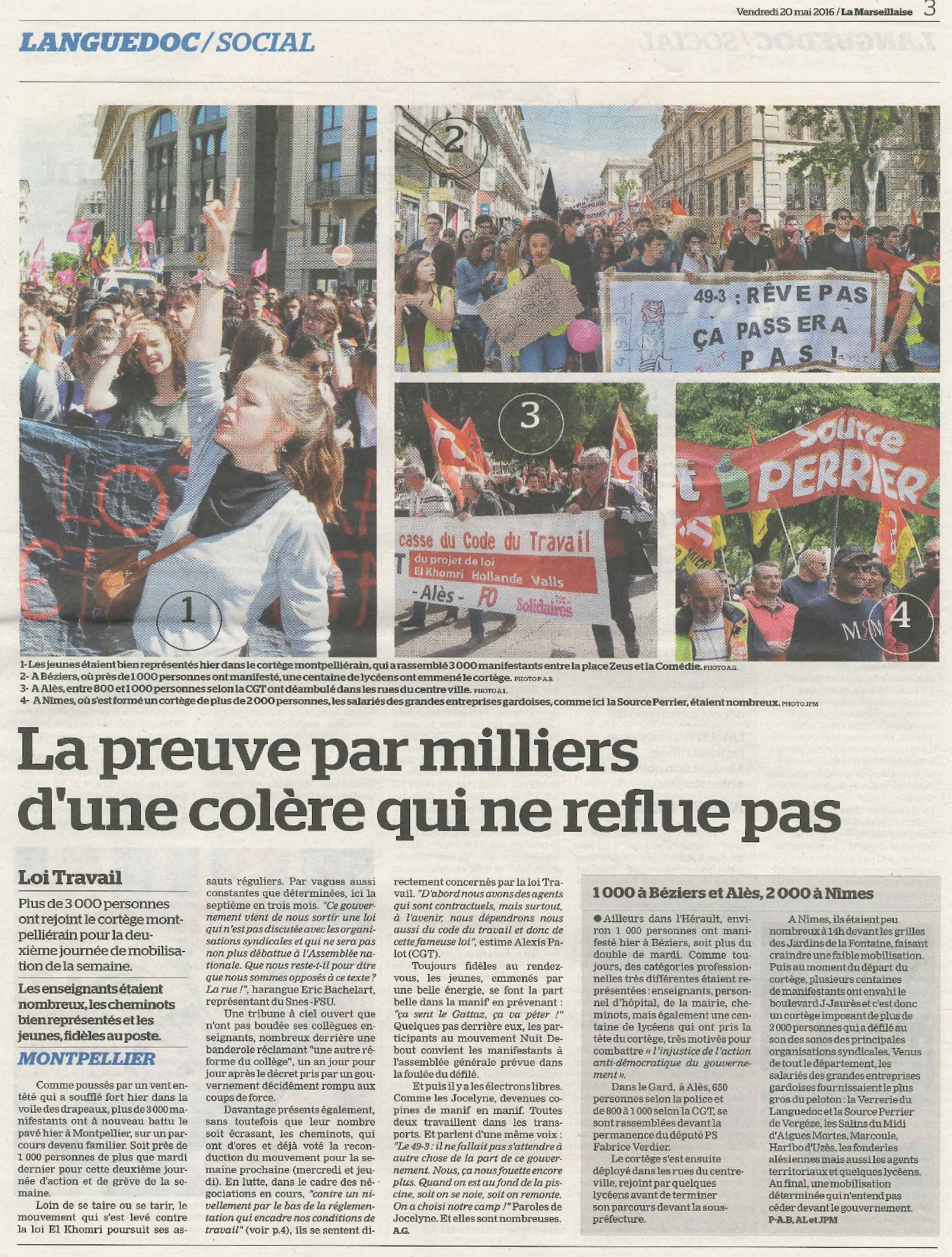 Vous êtes ici : Accueil Action Grève du 19 mai : revue de presse 22 mai 2016 Action Grève du 19 mai : revue de presse Imprimer l'article Avant le 19 La Marseillaise Midi Libre Après le 19 la UNE de La Marseillaise La Marseillaise