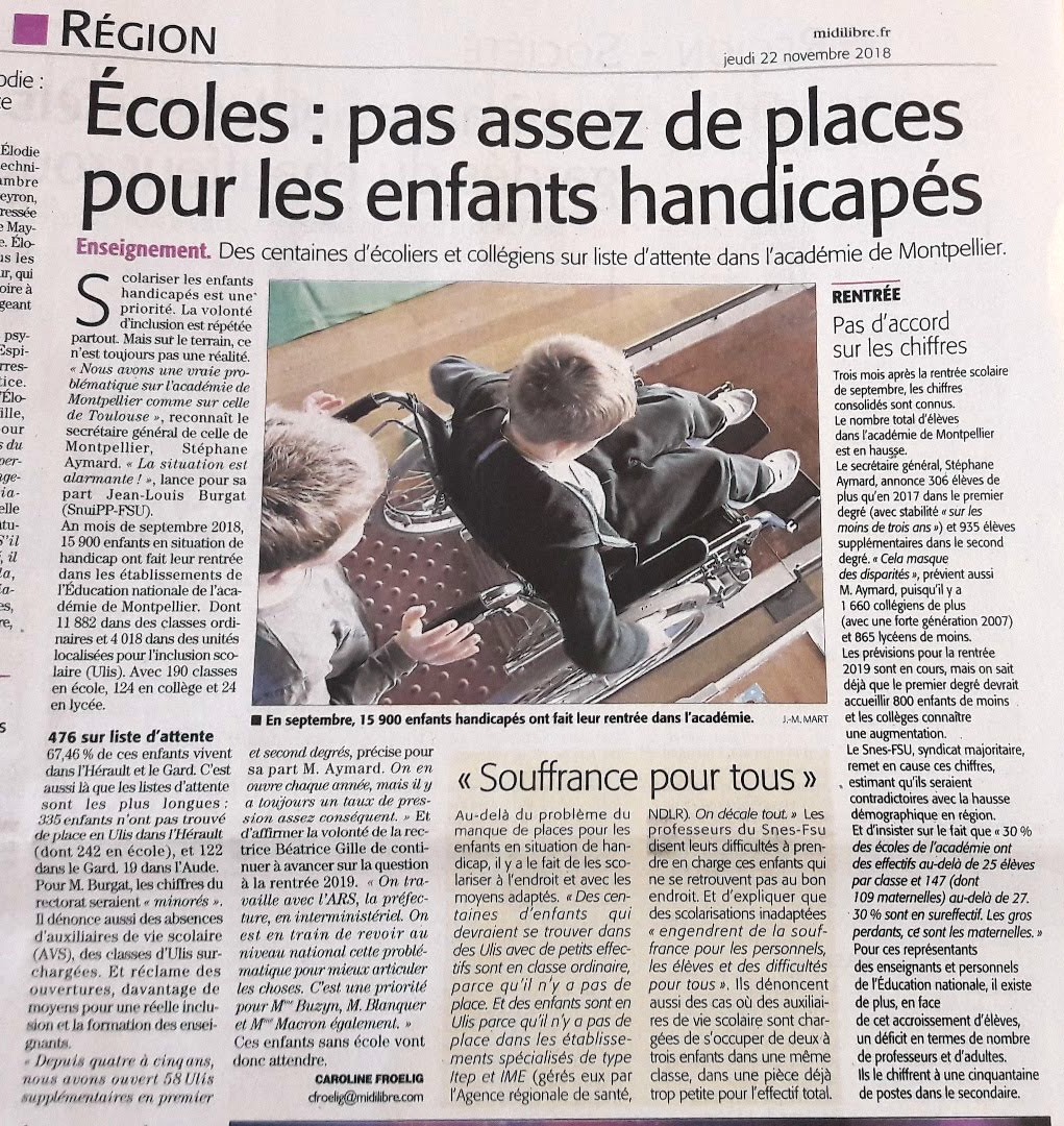 – accueil des élèves en situation de handicap : document enfin établi -partiellement- par le rectorat, qui valide ce que la FSU dit depuis des années : manque d’ULIS (on a chiffré à 45 le nb d’ULIS collèges manquantes, 11 en lycée), élèves en attente, déplacement des élèves relevant de structures médicalisées (IME/ITEP) vers les ULIS, et des ULIS vers les classes ordinaires ; le GT ASH qu’on a réussi à instaurer en mars et qui devait avoir lieu en oct aura lieu début janvier ; lors de la conférence de presse que la FSU avait convoquée après le CTA, on a insisté sur ce pointt avec le Midi-Libre, d’où un article le surlendemain