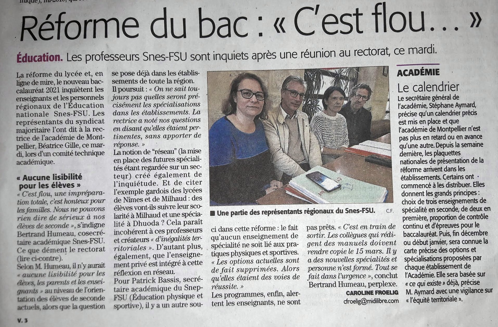 – mise en place de la réforme du lycée : carte académique des spécialités, options et langues pour la rentrée 2019 (question diverse de la FSU) : aucune info de la part du rectorat sur ce point (!!!) ; tt se fait ds l’opacité la plus totale dans les réseaux des lycées ; toutes les questions qu’on a posées (carte des spé, spé mutualisées, financement des options, place du privé, formation des enseignants sur les nouveaux programmes) sont restées sans réponse, même si la rectrice les a trouvées très pertinentes ! On avait demandé un GT spécifique, il aura lieu le 19/12. Voir l’article du Midi-Libre le lendemain et l’article + vidéo en ligne.
