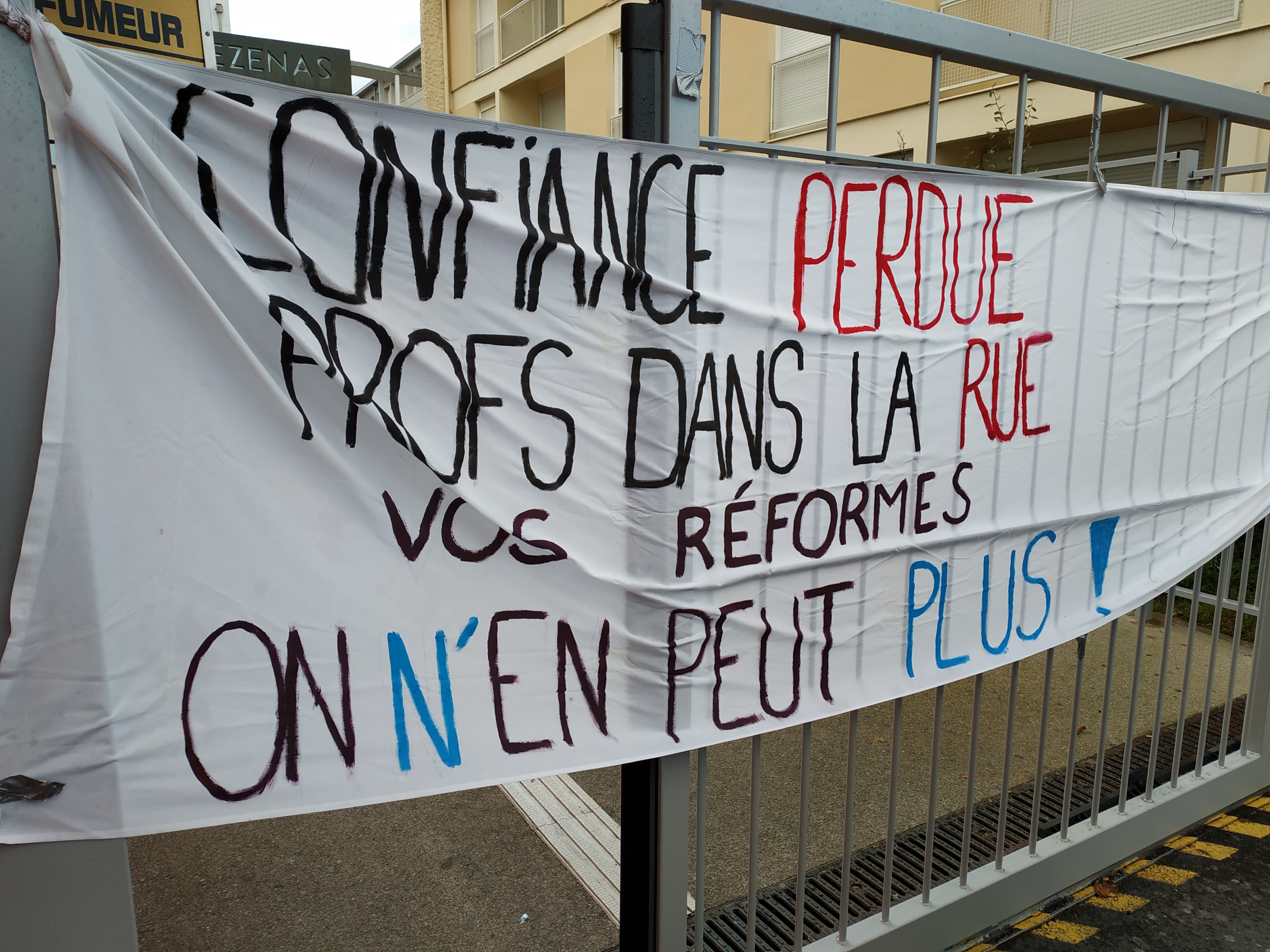 Ce matin à Bagnols sur Cèze, une action a été menée devant les lycées où on a parlé aux lycéens et étudiants en BTS pour leur expliquer nos revendications. On était apparemment 10 sur le site du Vigan Braquet et 5 sur le site du Gérard Philipe. Pas de reconduite de la grève pour les collègues cependant