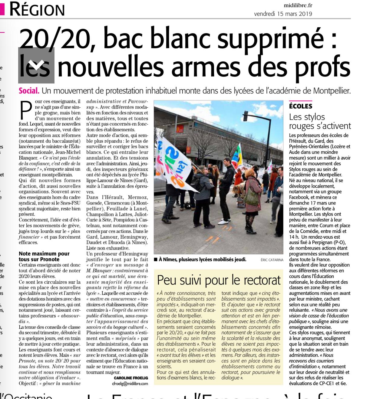 15/3 - Midi Libre région : 20/20, bac blanc supprimé : les nouvelles armes des profs