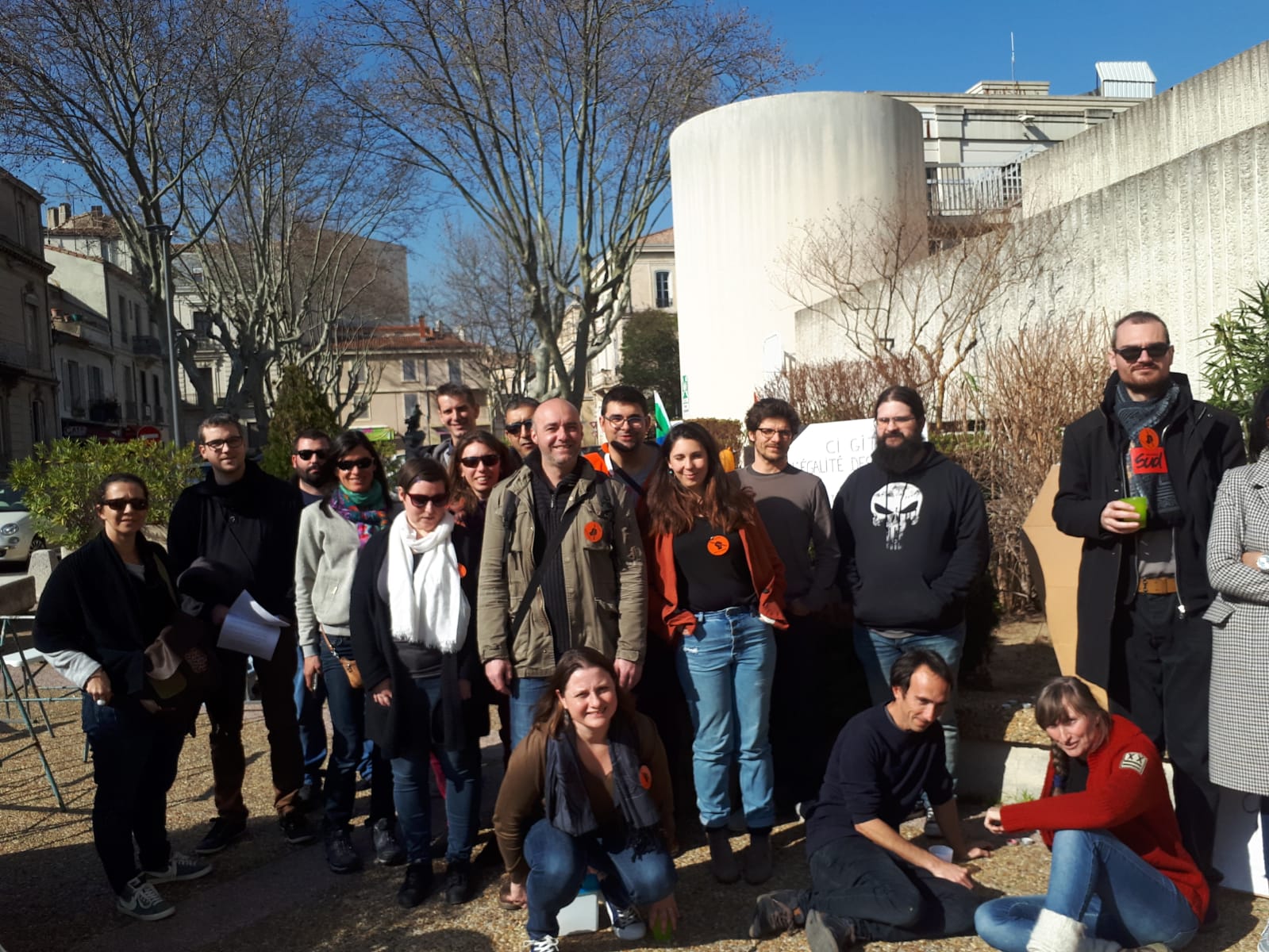 Rassemblement aux Arènes à 14h, puis manifestation déambulatoire dans la vile (entre 300 et 400 personnes). Festif, joyeux, chantant. Visite de la permanence de la députée Françoise Dumas (LREM), bon enfant et respectueuse des biens et des personnes, malgré ce que la députée dit. AG à 16h, 90 participants.