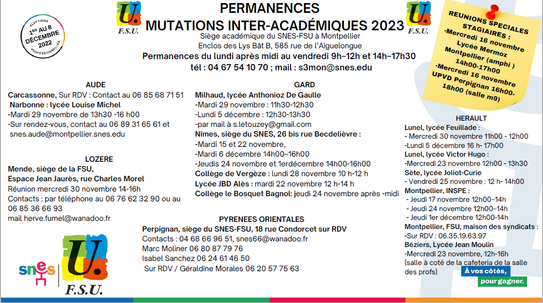 Vous êtes ici : Accueil A la une Réunions et permanences mutations inter académiques 2023 14 novembre 2022 A la une Réunions et permanences mutations inter académiques 2023 Imprimer l'article Retrouvez toutes les réunions d’information et les permanences pour vous accompagner dans vos mutations inter académiques.